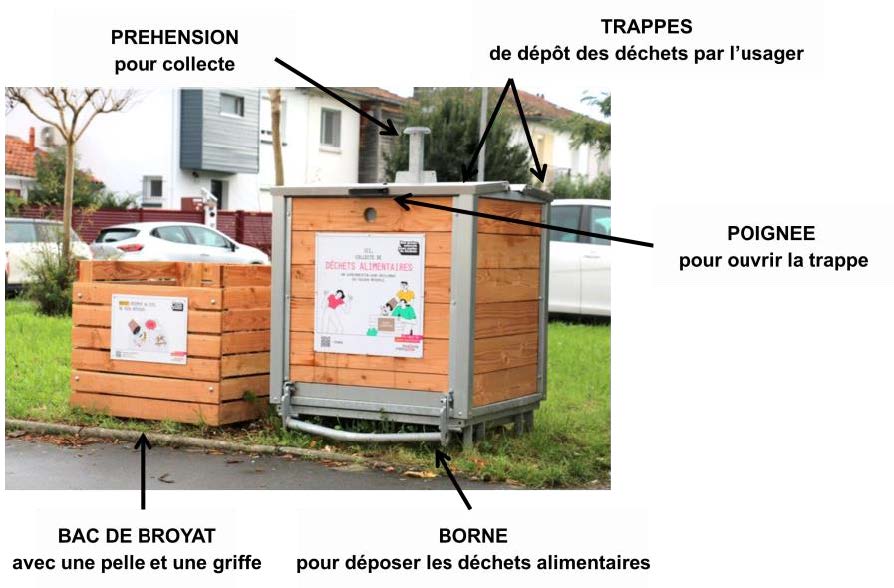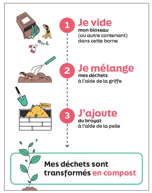 Les bornes de collecte sont installées sur l’espace public et sont accessibles en permanence aux habitants (7J/7 / 24h/24). Ils peuvent y déposer en vrac l’ensemble des déchets alimentaires produits à la maison. A chaque apport, l’usager est invité à déposer ses déchets alimentaires. Pour les composter, il doit ensuite les mélanger avec l’aide de la griffe puis ajouter du broyat (outils et broyat mis à disposition dans le bac de broyat à côté de la borne).