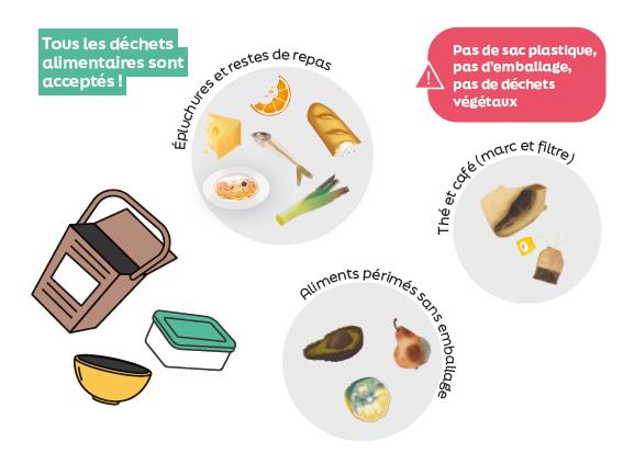 Restes de repas, épluchures, café, thé, coquilles d’œufs, os de poulet, fruits abîmés, produits périmés … Tous les déchets alimentaires sont acceptés en vrac ou dans un sac kraft (sans plastique). En revanche, aucun sac en plastique (même biodégradable ou compostable) et aucun emballage ne sont acceptés dans les bornes. Les déchets végétaux sont également exclus de cette collecte.